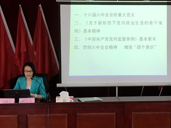 吳梅芳教授從全面從嚴治黨的高度,深刻闡述了黨的十八屆六中全會的重大意義,緊緊圍繞加強和規(guī)范黨內(nèi)政治生活的重要性等四個方面對《關于新形勢下黨內(nèi)政治生活的若干準則》進行了重點解讀,并就《中國共產(chǎn)黨黨內(nèi)監(jiān)督條例》修訂的內(nèi)容和特點等方面作了提煉分析,對學習貫徹黨的十八屆六中全會精神、不斷強化“四個意識”提出了具體要求。她的報告系統(tǒng)全面,層次分明,站位高、解讀準、接地氣,既有理論深度,又有生動實例,對廣大黨員干部學習領會和掌握黨的十八屆六中全會精神,全面提升企業(yè)黨建工作水平具有重要的指導意義和促進作用。