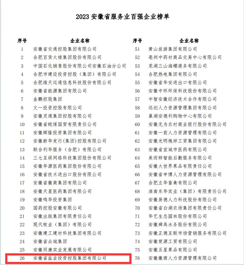 省生態環境集團(原省鹽業集團)入選“2023安徽省百強企業”榜單,位列第87位;入選“2023安徽省服務業百強企業”榜單,位列第26位。這是我公司連續第4年入選省百強企業榜單、省服務業百強企業榜單。