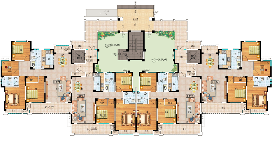 突出入戶大堂、小區(qū)入口。廣場地面雕刻出方磚鋪地,運用人工分色處理,打磨噴涂上色;點綴一些汽車、行人、休憩椅、雕塑小品及各種植物等環(huán)境配套設(shè)施使商業(yè)廣場更添休閑味道,環(huán)境更加豐富。并在廣場設(shè)置地?zé)艏盁艄庖栽黾幽P鸵咕靶ЧT诳傮w協(xié)調(diào)的基礎(chǔ)上,盡量提高空間感和視覺效果,按照實際施工尺寸適當(dāng)拉寬環(huán)境及建筑樓距,適當(dāng)放大中心園林空間,以獲得更感性合理的模型視覺(多設(shè)置公園椅、庭園燈、樹木等),充分體現(xiàn)出城市自然與人文環(huán)境相互融合的特性。