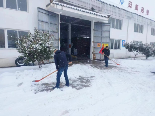 淮南鹽業公司職工清掃倉庫前積雪,保障運送暢通。